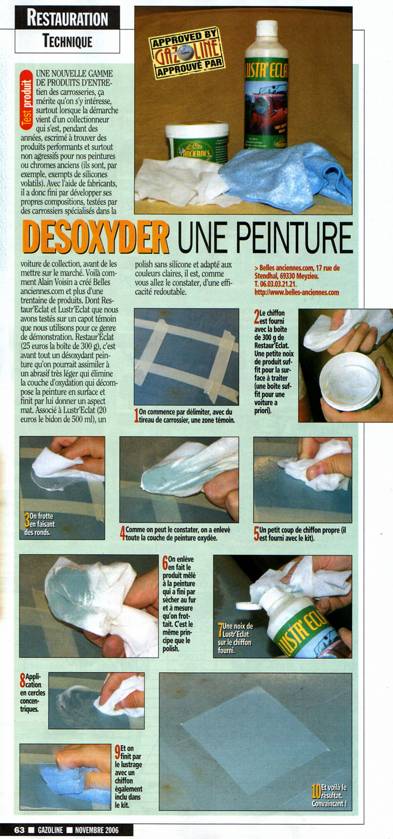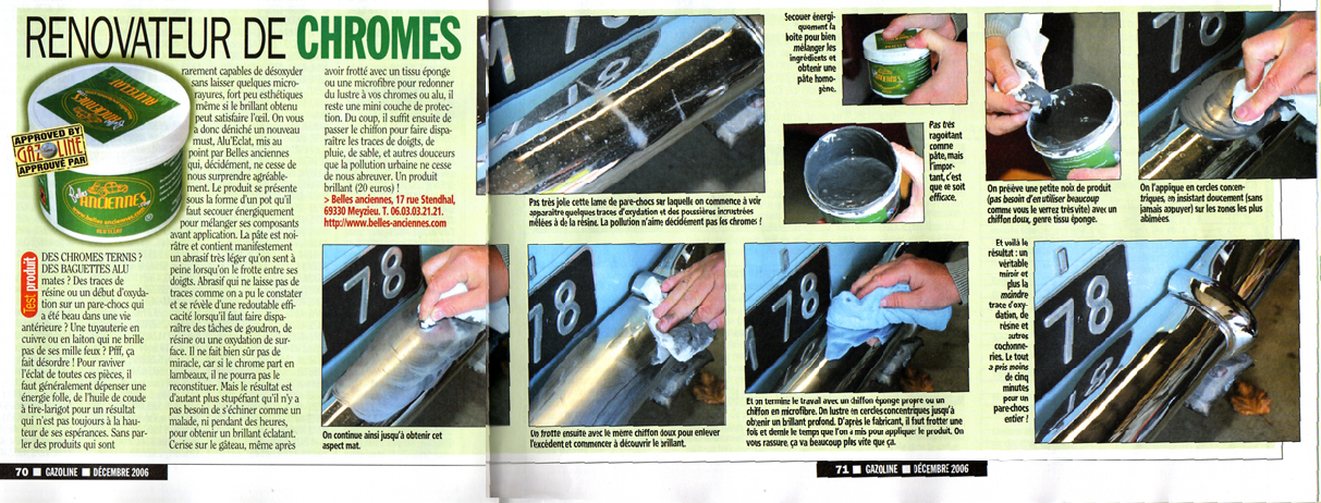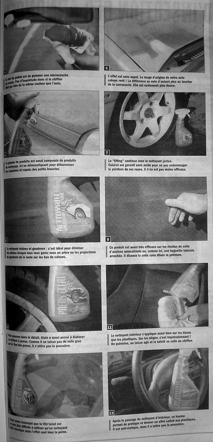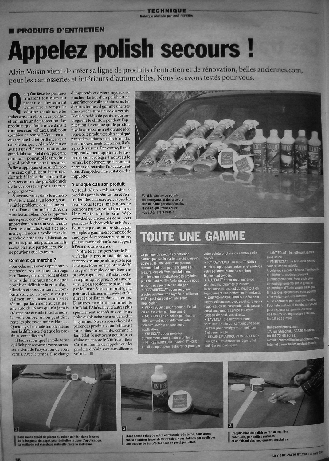 NOVEMBRE 2008 Nous serons présents du 7 au 9 Novembre à EPOQU'AUTO à LYON (69) Lieu : Eurexpo * Nous serons présents du 21 au 23 Novembre au SALON MOTO LEGENDE à PARIS (75) Lieu : Parc Floral OCTOBRE 2008 Nous serons présents les 25 & 26 Octobre à AUTOMEDON au BOURGET (93) Lieu : Parc des expositions SEPTEMBRE 2008 Nous serons présents les 20 & 21 Septembre à l'AUTO MOTO RETRO FESTIVAL de ROUEN (76) Lieu : Palais des expositions * Nous serons présents les 6 & 7 Septembre à la bourse de VERNA (38) Lieu : Terrain communal AOUT 2008 Nous serons présents les 30 et 31 Août à la bourse de RUMILLY (74) * Nous étions présents du 15 au 17 Août à l'ICCCR à ROME (Italie) Lieu : Circuit automobile de Vallelunga JUIN 2008 Nous étions présents les 21 & 22 Juin au GRAND PRIX HISTORIQUE de MARSEILLE (13) Lieu : Parc Borely MAI 2008 Nous étions présents du 16 au 18 Mai au RETRO FESTIVAL DU VAR (83) Lieu : Base nature François Léotard à FREJUS * Vous avez rerouvé les produits Belles Anciennes les 3 et 4 Mai au salon de PERPIGNAN (64) sur le stand de notre revendeur ID SUD COLOR Lieu : Parc des expositions * Nous étions présents du 2 & 4 Mai au Salon CLASSICS DAY'S (58) Lieu : Circuit automobile de Nevers Magny Cours Lors de cette manifestations, nous ferons une démonstration en direct de la remise en état d'une AUTOBIANCHI LUTECE avec 17.000 Km d'origine. Polissage, lustrage et cire de protection pour la peinture, remise en état des chromes et alus, nettoyage intérieur et moteur... Toute l'auto sera traitée avec les produits Belles Anciennes de restauration, de nettoyage et de protection. Une véritable démonstration grandeur nature durant les 3 jours de cette manifestation. AVRIL 2008 Nous étions présents les 19 et 20 Avril au salon de SAINT MARCELLIN (38) Lieu : Parc des expositions * Nous etions présents les 5 & 6 Avril au Salon de PALAVAS LES FLOTS (34) Lieu : Parc des expos MARS 2008 Nous étions présents du 28 au 30 Mars au MOTOR FESTIVAL d'AVIGNON (84) Lieu : Parc des expositions * Nous étions présents les 8 & 9 Mars au Salon Champennois de REIMS (51) Lieu : Parc des expos FEVRIER 2008 Nous étions présents du 8 au 17 Février à RETROMOBILE PARIS (75) Lieu : Paris Expo Portes de Versailles * Le 26 Février, AUTO PLUS (N°1016) a publié un essai comparatif de 28 nettoyants jantes. JANT'ECLAT termine second de ce comparatif (devant les plus grandes marques de produits dédiés à l'automobile). JANT'ECLAT obtient la meilleure note d'efficacité avec 17,5/20 . La note globale est de 5 étoiles sur 5. JANVIER 2008 Nous étions présents les 26 & 27 Janvier à la bourse de VIF (38) Lieu : Salle Polyvalente * Nous étions présents les 12 & 13 Janvier au salon de NIMES (30) Lieu : Parc des Expositions DECEMBRE 2007 Nous étions présents les 1 & 2 Décembre au salon de CHAMBERY (73) Lieu : Parc des expositions de Chambéry * Nous étions présents les 8 & 9 Décembre au salon de CAVAILLON (84) Lieu : Parc des Expositions de Cavaillon NOVEMBRE 2007 Nous étions présents les 9, 10 & 11 Novembre à EPOQU AUTO LYON (69) Lieu : Eurexpo Lyon-Chassieu Site Internet : www.les3a.com OCTOBRE 2007 Nous étions présents les 6 & 7 Octobre au festival Auto Brocante de LOHEAC (35) Lieu : Musée Manoir de l'Automobile Site Internet : www.manoir-automobile.fr * Nous étions présents les 13 & 14 Octobre à AUTOMEDON (93) Lieu : Parc des Expositions du Bourget SEPTEMBRE 2007 Dans son numéro 732, le magazine l'Auto-Journal a publié un essai de 8 nettoyants goudron résine. BELLES ANCIENNES se classe premier de ce comparatif et mon produit reçoit la mention "C'est notre favori, indiscutablement. Il nettoie à fond les résidus de goudron et de résine et ne laisse aucune trace de gras après rinçage. C'est le produit le plus efficace de notre sélection." Nous étions présents les 1er & 2 Septembre à BETHUNE AUTO RETRO (62) * Nous étions présents les 15 & 16 Septembre à COLOMIERS (31 à coté de Toulouse) Lieu : Hall Comminges * Nous étions présents les 29 & 30 Septembre à l'AUTO MOTO RETRO de ROUEN (76) Lieu : Parc des expositions de Rouen / 12 rue de Buffon AOUT 2007 Dans son numéro 730, le magazine l'Auto-Journal a publié un essai de 8 nettoyants de carrosserie sans eau. LAV’ECLAT fait partie de ce comparatif et se classe premier en terme de qualité et second en ergonomie. "Ce nettoyant est très efficace, il ne laisse aucune trace, et cela presque sans frotter. Parmi ses autres atouts, on comptera sa notice d'utilisation, détaillée, son utilisation, simplissime, et son encombrement minimal. On a aussi aimé la couleur verte du liquide qui permet une meilleure précision lors de l'utilisation." JUILLET 2007 Dans son numéro 984, le magazine Auto Plus a pubilé un essai comparatif de 12 antimoustiques. Le démoustiquant BELLES ANCIENNES obitent la note de 4 étoiles sur 5 ! JUIN 2007 Nous étions présents les 30 Juin et 1er Juillet au RESTRO FESTIVAL de CAEN Lieu : Hippodrome de CAEN Site Internet : RETRO FESTIVAL DE CAEN * Nous étions présents les 16 & 17 juin au FESTIVAL DES BELLES MECANIQUES de ROUBAIX Lieu : Parc des Sports du Vélodrome de ROUBAIX Site Internet : FESTIVAL DES BELLES MECANIQUES * Nous étions présents les 9 & 10 Juin à la LOCOMOTION EN FETE de la FERTE-ALAIS Lieu : Aérodrome de Cerny la Ferté-Alais au Sud de Paris Site Internet : La LOCOMOTION EN FETE MAI 2007 L'AUTO JOURNAL a publié un essai comparatif des nettoyants vitres dédiés à l'automobile. AVRIL 2007 Nous étions présents les 7 & 8 Avril à la BOURSE D'ECHANGE DE PALAVAS LES FLOTS (34) Lieu : salle Bleue * Nous serons présents les 28 & 29 Avril au SALON DE PERPIGNAN (66) * Nous serons présents les 21 & 22 Avril à la BOURSE DE TARBES (65) Lieu : Parc des Expositions Horaires : 7h à 18h MARS 2007 Le magazine AUTOJOURNAL vient de publier un essai des 10 meilleurs Nettoyants jantes du marché. JANT'ECLAT finit premier en efficacité de nettoyage devant tous les autres
