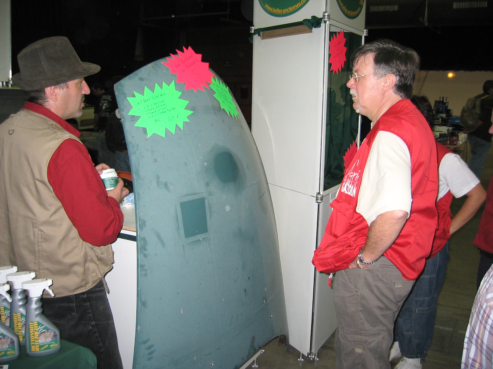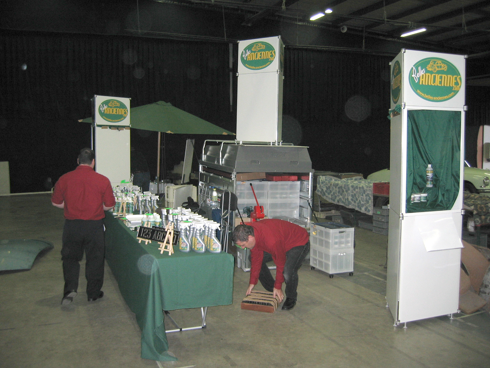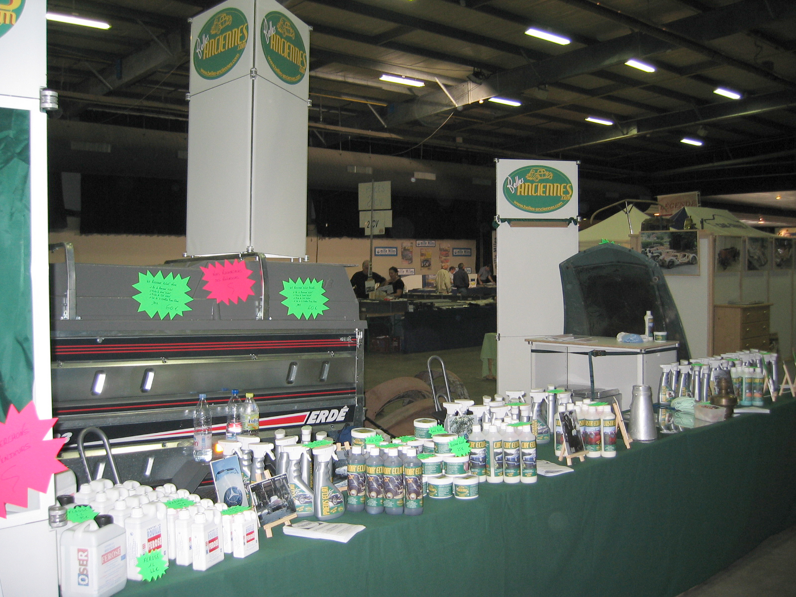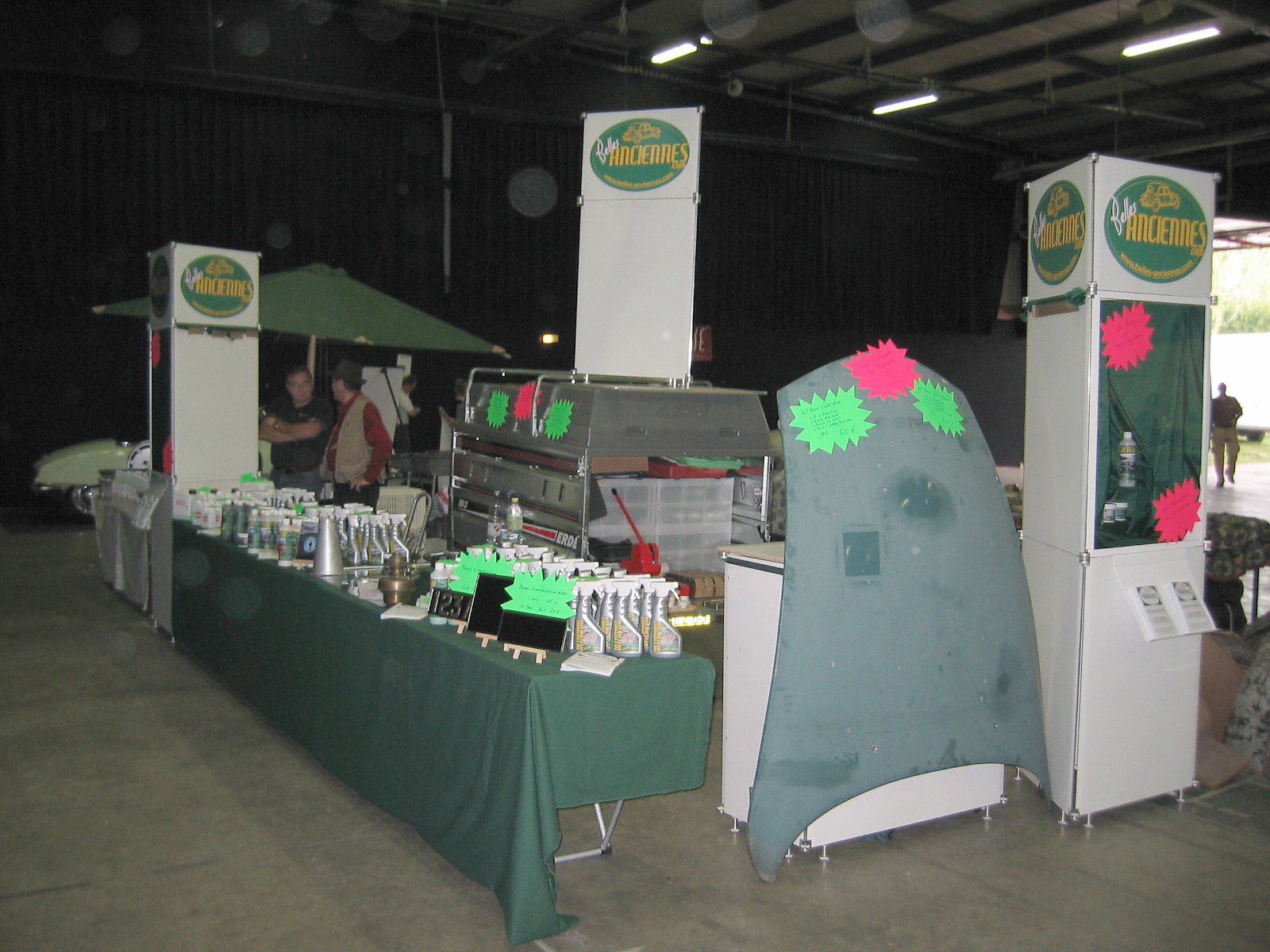 Et voici le stand terminé 20mn avant l'ouverture. On aura le temps de se prendre un café... Le capot à même ses premières traces de nettoyage de la peinture.